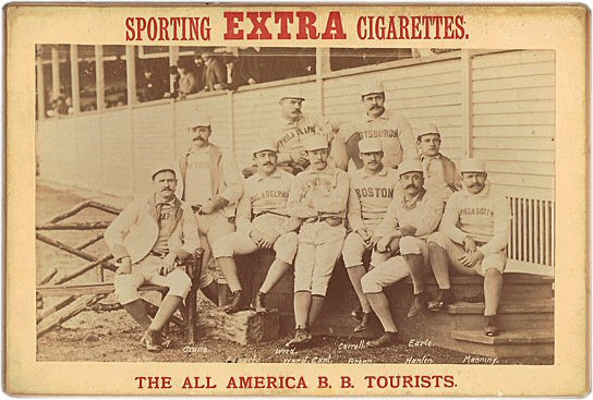 Produced in 1888 by Kinney Tobacco Co. of New York City and advertising their Sporting Extra Cigarettes, this obscure set features team photos of the two teams from Spalding’s World Tour. At this time,
